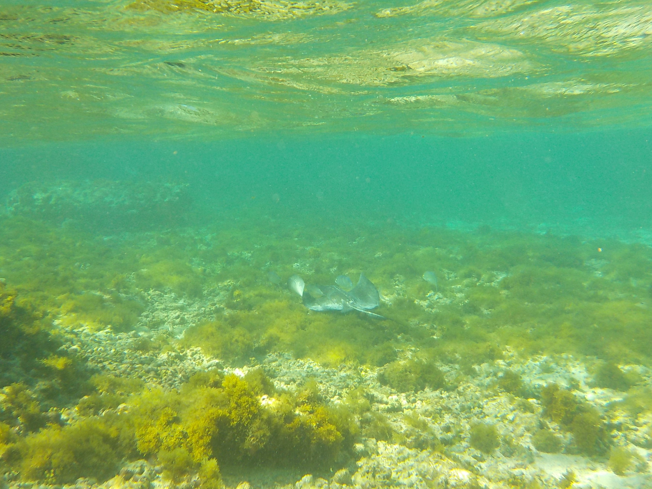 Une raie qui zone avec sa suite de poissons